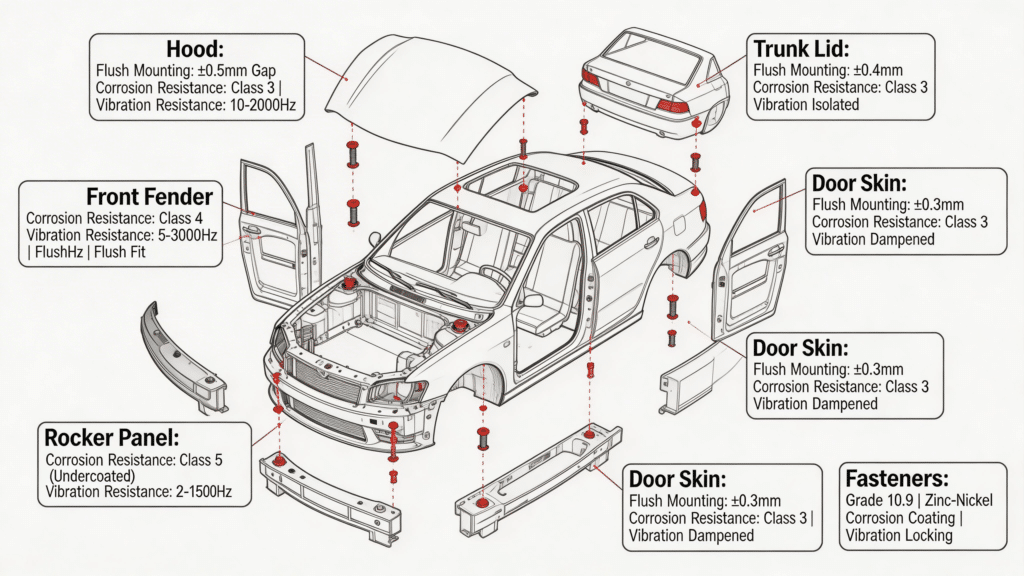 Different vehicle zones impose different performance demands on clip nuts. The matrix below guides specification by location.
